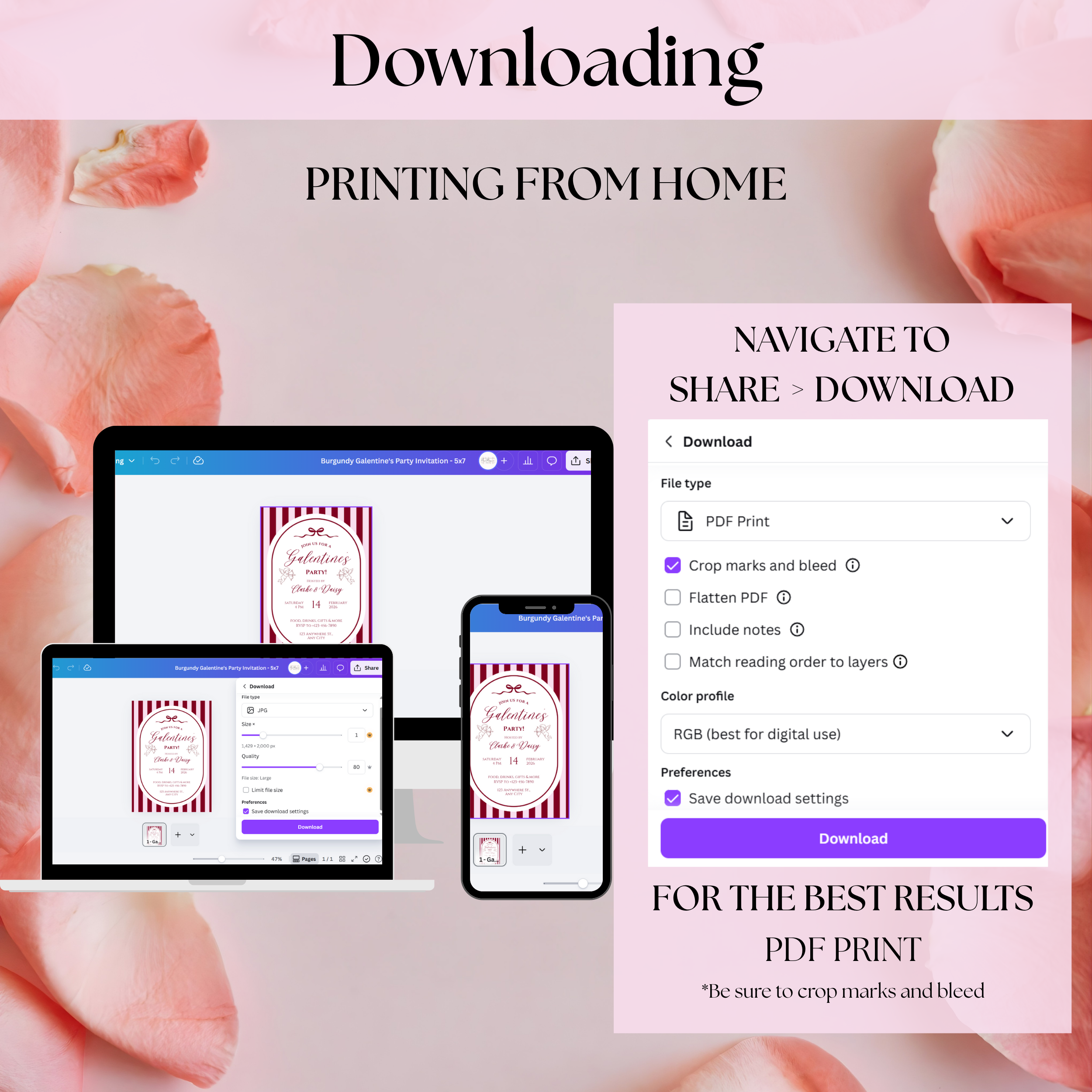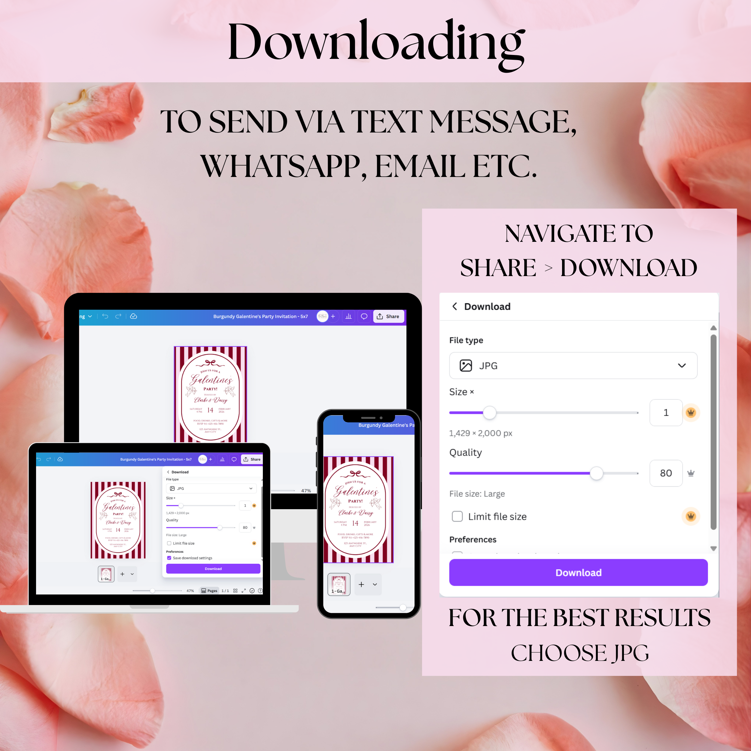 Download as a JPG and send via text or email. For best quality, make sure files are sent at full size and resolution.