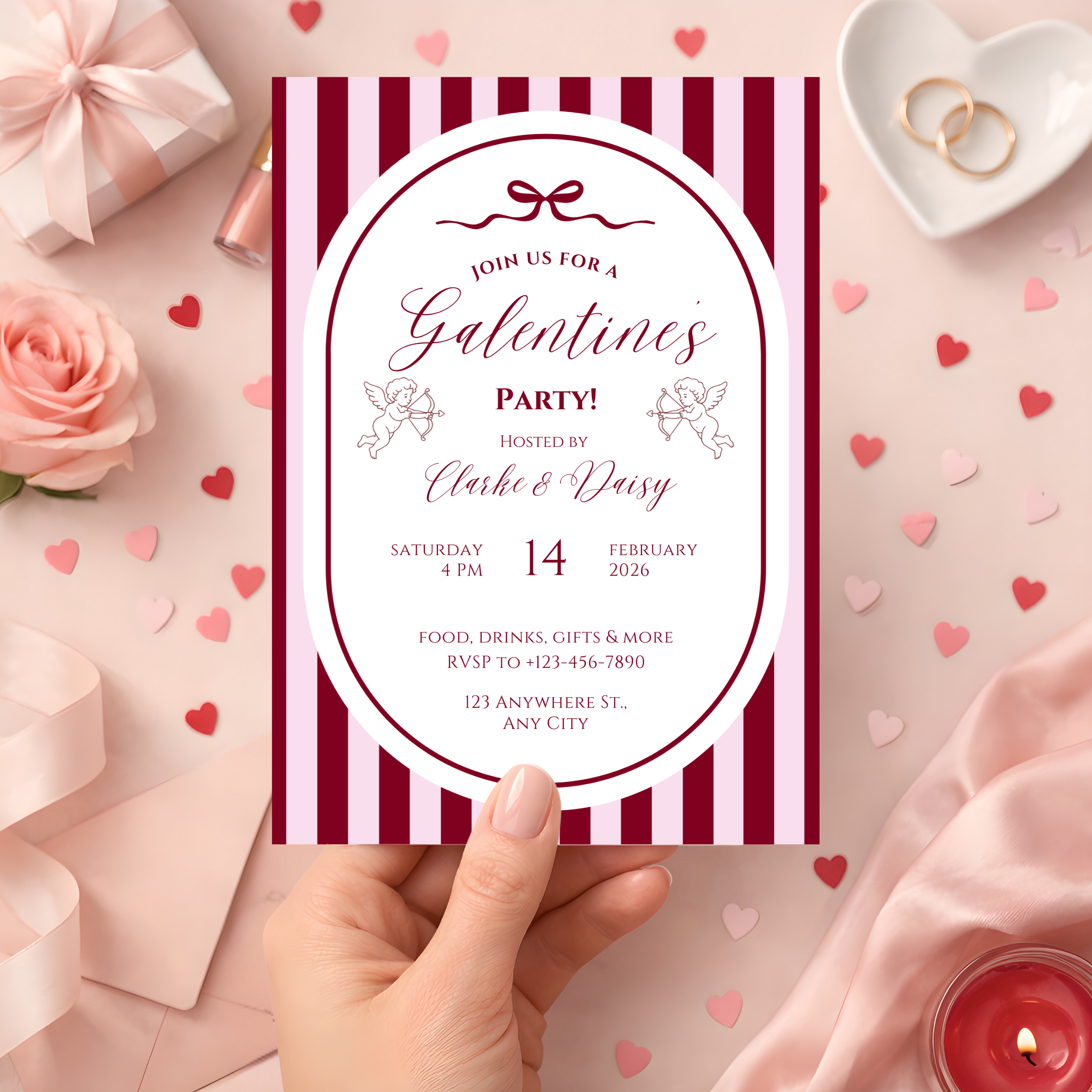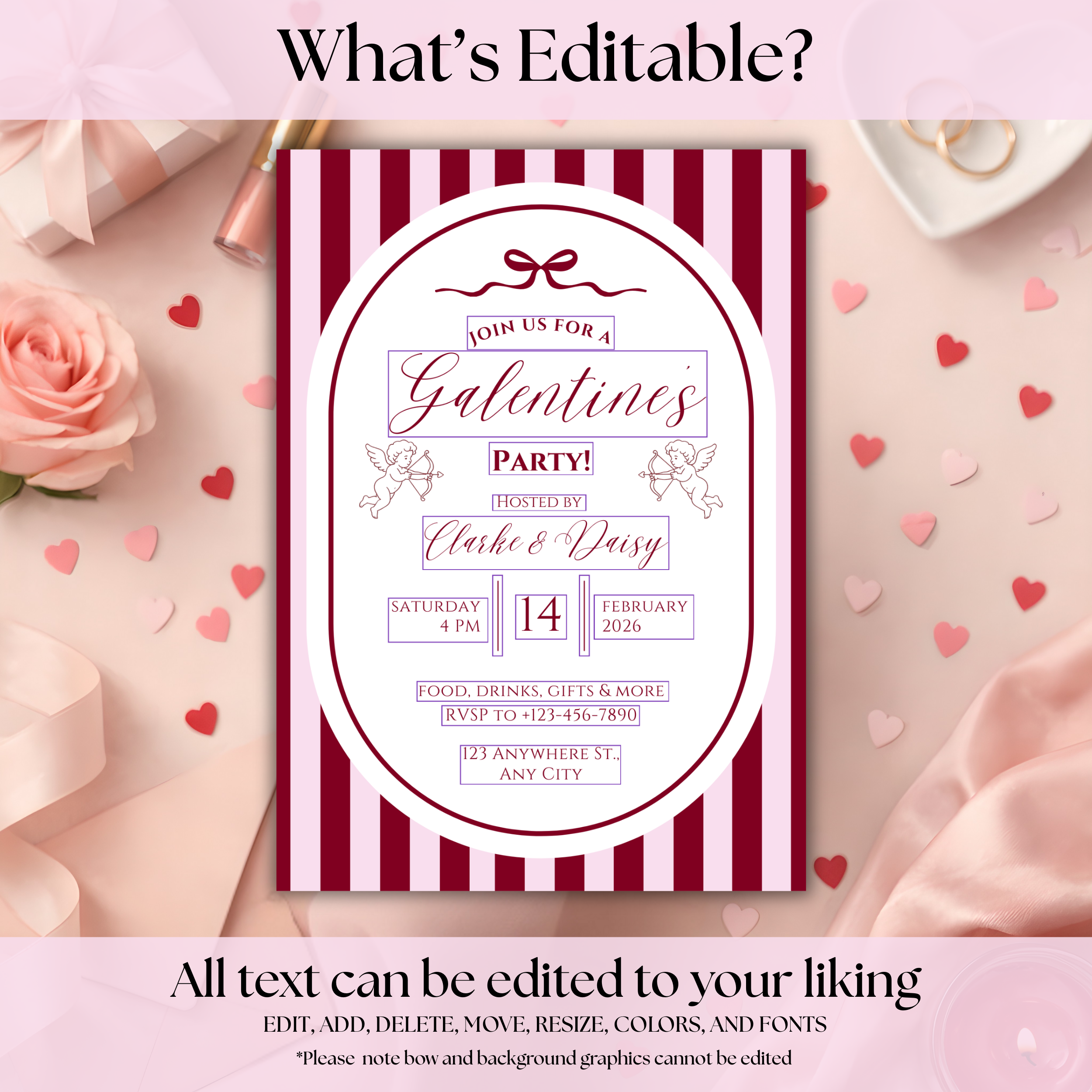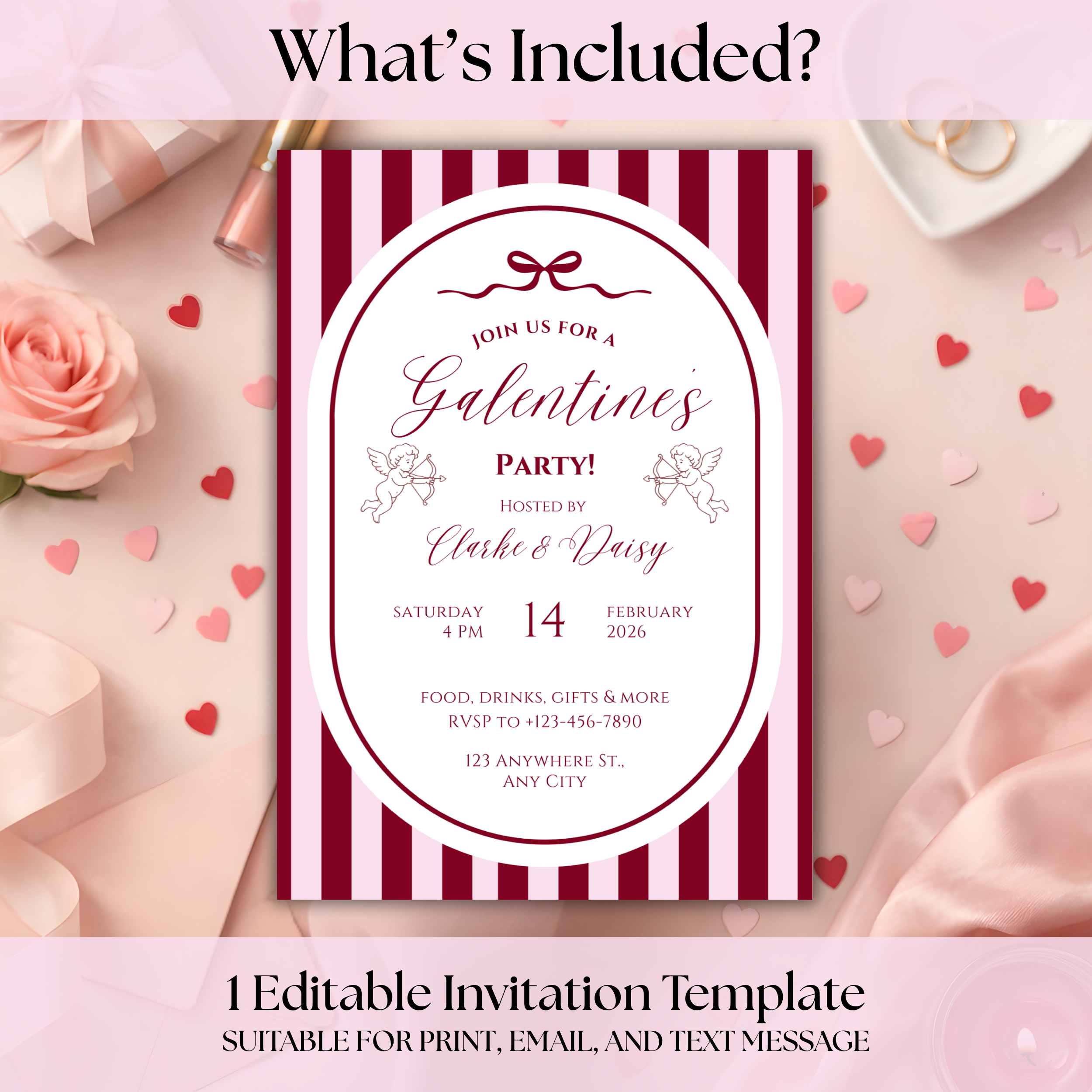 Will you be my Galentine? Create a beautiful, polished Galentine’s Day invitation in minutes with this editable Canva template. Perfect for Galentine’s parties, girls’ night, or Valentine’s brunch, this invitation is easy to personalize and can be sent digitally or printed at home. No design experience required. This is a digital download only. No physical items will be shipped.